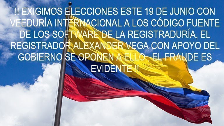!! EXIGIMOS ELECCIONES ESTE 19 DE JUNIO CON VEEDURÍA INTERNACIONAL A LOS CÓDIGO FUENTE DE LOS SOFTWARE DE LA REGISTRADURÍA, EL REGISTRADOR ALEXANDER VEGA CON APOYO DEL GOBIERNO SE OPONEN A ELLO , EL FRAUDE ES EVIDENTE !!