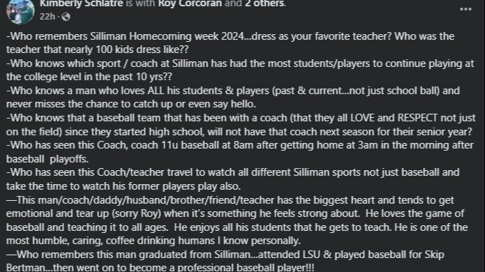 Coach Roy, a former Major League Baseball player, former LSU baseball player, former Gulf Coast Community College player, and Silliman alumnus, brings the highest level of expertise, qualification, passion, and a profound connection to our school’s heritage. His professional experience, as well as his unique character, has elevated the baseball team to remarkable success, with a 115-65 record overall, consistent playoff appearances every year, and 7 players playing at the collegiate level just this year. Beyond these achievements, Coach Roy takes the time to mold each child individually, ensuring they grow as athletes and individuals. His coaching instills skill, discipline, and teamwork producing athletes who embody Silliman Institute’s values of excellence and integrity. The impact he makes on our children is elite. Many students attend Silliman just to play for Coach Roy. I know for myself, I have waited many years for my son to be able to play for him. He is an iconic representative of Silliman, and we are proud to call him ours. The future was very bright! Why rip it away?