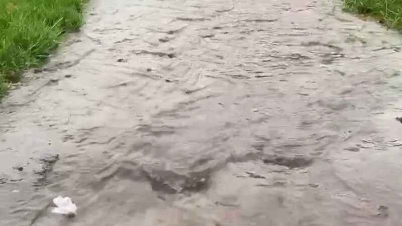 A resident captured video footage showing the footpath transformed into a stream of flowing water. The entire walkway was submerged, leaving no safe route for anyone walking to school.