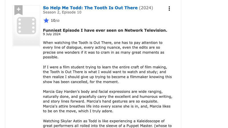 Aggiornamento sulla petizioneReinstate So Help Me Todd & Four More, Strike Honoring, Unethically Canceled CBS Series.The Tooth is out There Review on IMDB, please Read.
