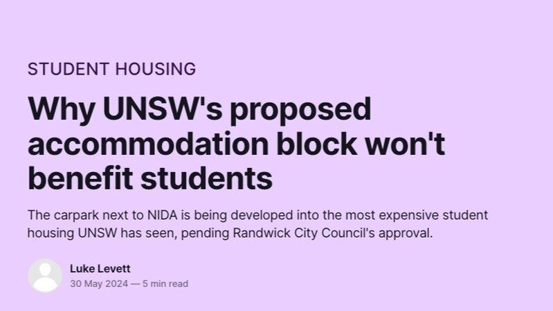 We have come across an excellent article written by a student body newspaper within UNSW that echoes our concerns about the development at 215B Anzac Parade. Please give it a read and send on to people who you know are concerned about this development. There is a template within the article for students to make submissions to Randwick Council.