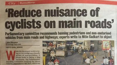 The standing Parliamentary Committee studying the Motor Vehicles (Amendment) Bill 2016, has recommended that "pedestrians and non-motorised vehicles (mainly the cyclists) be restricted from using main roads and highways in metro cities."