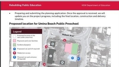 As a concerned parent, my son attends Umina Beach Public School where plans for the construction of a new preschool and onsite car park have been proposed. This plan, however, includes uprooting our infant's playground and oval, significantly affecting their outdoor play area.