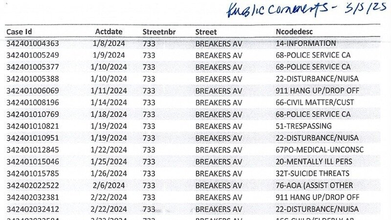 At the city commission meeting on March 5, a speaker gave the commissioners a report of all calls to made to the the Fort Lauderdale Police Department for service at 733 Breakers Dr - the current location of the Covenant House facility. The calls were made from January 2024 through February 2025.
