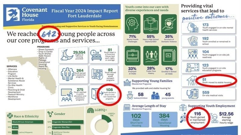 In 2024, Covenant House published its Fiscal Year 2024 Impact Report Fort Lauderdale, which contains data that summarizes how its program performed for that year. But - by its own admission - its approach doesn't yield much in the way of results.