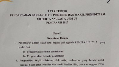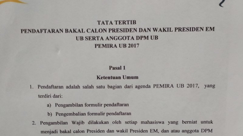 Revisi pengembalian berkas PEMIRA UB telah dinodai. Senin, 6 November 2017 PEMIRA UB telah dicoreng prosesnya oleh oknum mahasiswa yang tidak kompeten karena terbiasa dengan budaya terlambat.