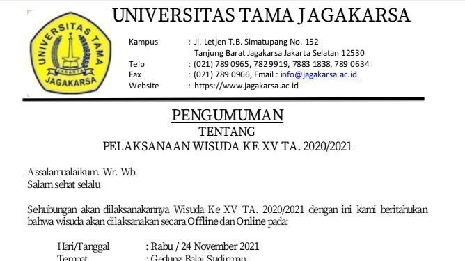 Sehubungan dengan dikeluarkannya Pengumuman Tentang "PELAKSANAAN WISUDA KE XV TA. 2020/2021", Kami Wisudawan Universitas Tama Jagakarsa menolak atas kenaikan biaya wisuda dari tahun sebelumnya yang dimana :