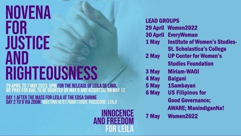 Various groups will lead the Novena Prayer from April 30-May 7 for Sen. Leila de Lima in anticipation of the court decision on May 8 (bail for Case 167) and May 12 promulgation of decision for Case 165. Please join us. Let’s storm the heavens for Sen. Leila’s acquittal and release!! #FreeLeilaNow