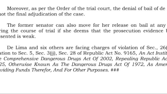 In an unprecedented move, the Supreme Court through the Public Information Office issued a Press Release on June 8, 2023 that "the denial of bail of De Lima is not the final adjudication of the case. The former Senator can also move for her release on bail at anytime during the trial if she deems that the prosecution evidence is weak."