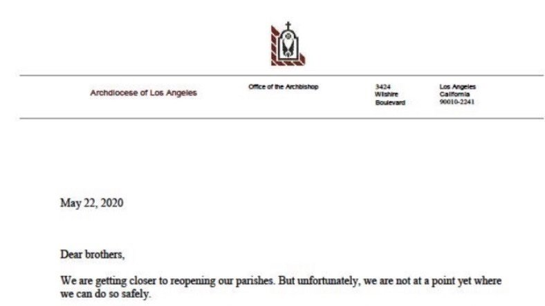 Archbishop Jose Gomez issued this letter yesterday. No plans to re-open the Church in Los Angeles.