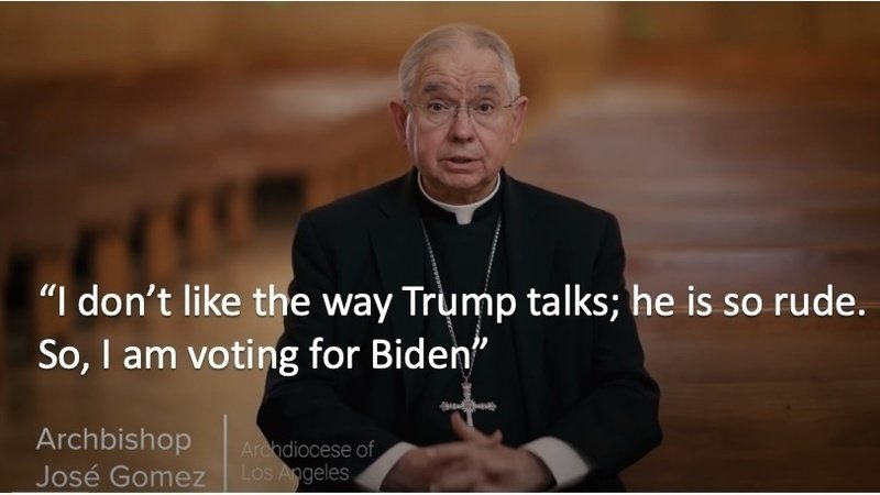 So, Gomez who is also the president of the United States Conference of Catholic Bishops is voting for a pro-abortion, pro-gay-marriage, socialist because he "does not like the way Donald J. Trump talks".... I am sure that he is also forcing priests in the archdiocese to support Biden... So infuriating!