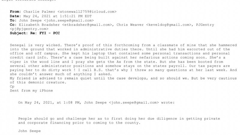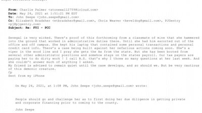 Mr. Palmer also went on to criticize Dr. Senegal, writing “Senegal is very wicked. There’s proof of this forthcoming from a classmate of mine that she hammered into the ground that worked in administrative duties there. Until she had him escorted out of the office and off campus. She kept his laptop that contained some personal transactions and personal credit card info. There’s a case being built against her nefarious actions coming soon. She’s a viper in the wood line and I pray she gets the Ax from the state. But she had been booted from several other administrator positions and somehow stays on the states payroll. Our tax payers are paying her to do dirty work! I call B.S. that’s why I threw so many questions at her last week. And she couldn’t answer much of anything I asked. My friend is advised to remain quiet until the case develops, and so should we. But be very cautious of this demonic creature.”