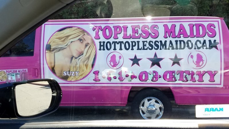 During an extremely difficult government Shutdown and a celebratory day for Dr. King, these "TOPLESS MAIDS" vans have been repainted and are being reproduced. This picture here is from today, in front of WARNER BROTHERS and UNIVERSAL STUDIOS -- one of their usual spots in Burbank.. along with Hollywood and as noted, now TEXAS.