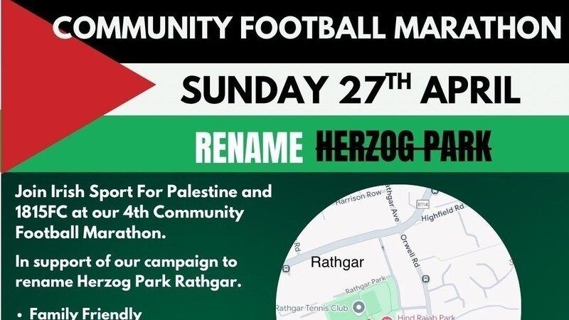Please support and share our 4th Community Football Marathon Match Sun 27th April 12-6PM in Rathgar, soon to be renamed Herzog Park. It is a roll on - off subs match over 6 hours, everyone welcome! Join us!!! #showisraeltheredflag