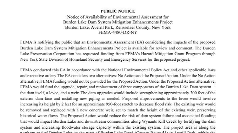 Burden Lake Dam System Mitigation Enhancements Project - News and Notices - Town of Sand Lake, New York
