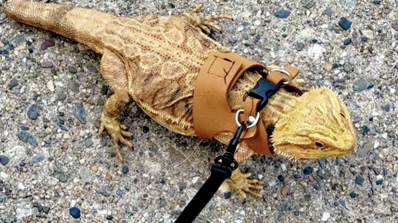 A terrifying bearded dragon walking on a leash. Watch out!!