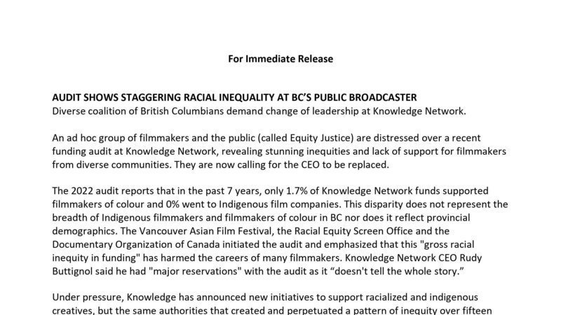 Atualização do abaixo-assinadoReplace Executive Leadership at Knowledge Network: BC's Public BroadcasterPress Release March 29th, 2022