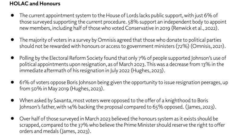 While this petition does not specifically include the appointments made by HOLAC (House of Lords Appointment Commission), by extension, the desire to see change in this system too in order to restore public confidence in our parliamentary democracy is inextricably linked with this petition. And the subsequent points, including the statistic from the Omnisis 2021 poll stating that 72% of respondents believe that political party donors should not be awarded an honour, speak volumes.