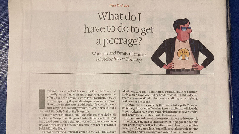 "What do I have to do to get a peerage?" asks Shrimsley, wickedly tongue-in-cheek. The short answer, he writes, is: "It's going to cost you. You can pay in cash or political service, same as always..." And, while recognising that there is "no guaranteed way, at least since Lloyd George got so greedy that selling peerages became a crime," he points out that ex-MPs and those who get a job at Downing Street, have significantly higher odds of securing a title. By way of illustration, Shrimsley reminds us that "...If you worked for Liz Truss you only had to put in seven weeks, and Johnson was also liberal with the baubles."