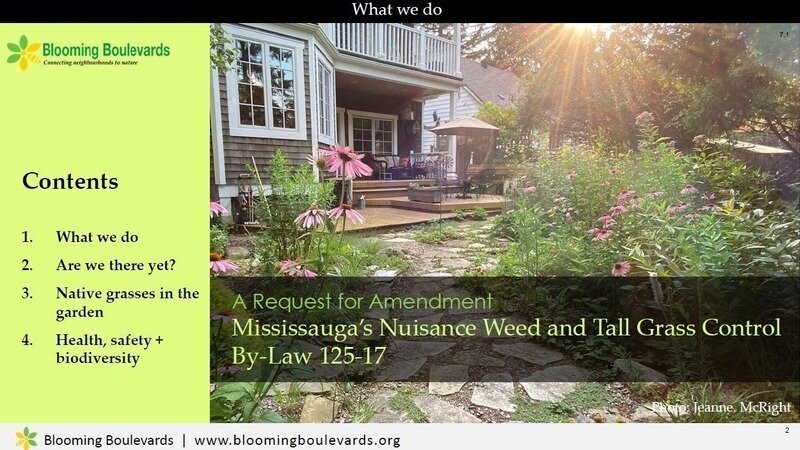 Jeanne McRight's timely Blooming Boulevards deputation scheduled for May 6th at the Civic Centre beautifully illustrates -- and clearly corroborates -- all that is problematic with the City of Mississauga's Administration and Enforcement of Tall Grass and Nuisance Weeds Control By-Law 125-2017 ...