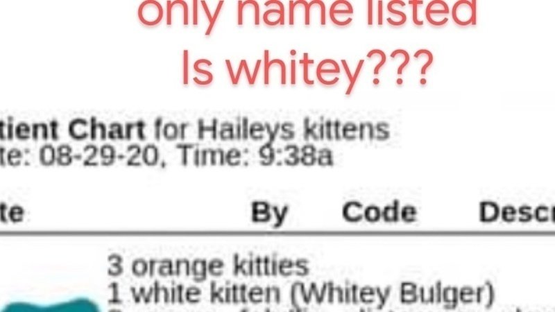 .... It’s just so ODD, because I only saw one document at her house, on her kitchen counter, that had said 3-4 orange kittens. NOTHING about a white kitten, and SUDDENLY, the records appear, with 3 orange cats, and “whitey bulger”( the cats name before I got her). And none of the orange cats had names.ONLY WHEN BEING ACCUSED OF FRAUD.