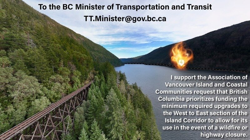 I support the Association of Vancouver Island and Coastal Communities request that British Columbia prioritizes funding the minimum required upgrades to the West to East section of the Island Corridor to allow for its use in the event of a wildfire or highway closure.