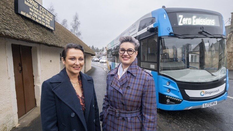 Siobhian Brown MSP and Fiona Doherty, Managing Director of Stagecoach West Scotland at the launch of the new electric bus fleet at Burns Cottage in Alloway.