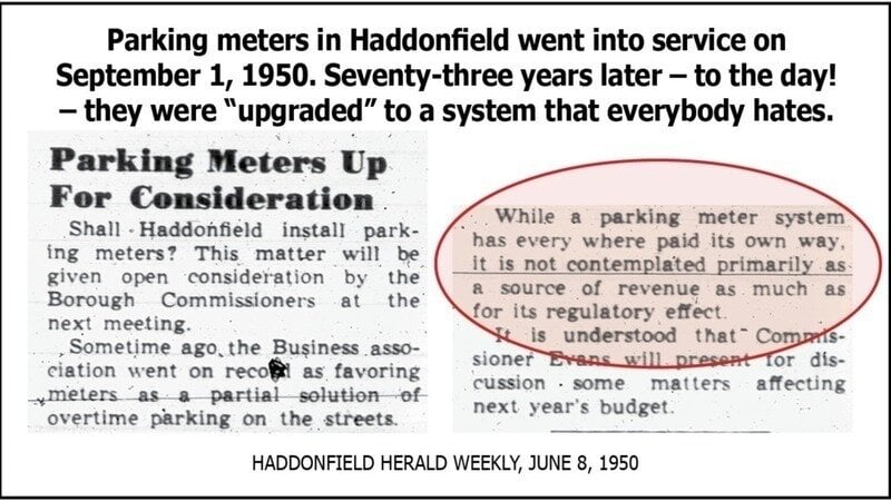 Ever since meters went into operation in Haddonfield – on September 1, 1950 – the main purpose of parking meters has been to deter those who work in the downtown business district from parking on Kings Highway and adjacent streets, thus making space on those streets available to shoppers.