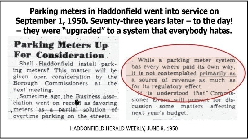 [A suggestion: Spare us the "news" – published recently in the Haddonfield Sun – that "Sundays [will be] free!" and "we will continue offering FREE parking during the Holiday season, a plus for retail businesses, visitors, and residents!" Give the 1,700+ folks who signed the petition to date – and everyone else who's affected – the real news, the true facts, and the detailed rationale ... sans the exclamation marks!]