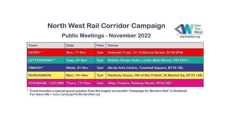 The first of our roadshow of 5 public meetings on the campaign starts today (MONDAY 7th NOVEMBER) in Derry/Londonderry, and continues over the next 10 days in each of the other key towns along the NW Rail Corridor route. Our sessions this week - in Derry, Omagh & Letterkenny - also have a special guest speaker from the hugely successful Campaign for Borders Rail in Scotland. They will reveal how they got 35 miles of railway line reopened in 2015 in rural Scotland, and pose the question - if it can be done in the Borders region of Scotland, then why not also in the border region of the island of Ireland ?