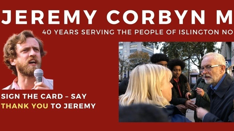 Islington Friends of Jeremy Corbyn (IFJC) are organising a thank you card for the 40th anniversary of our MPs election to Parliament. We want to thank him for his years of service to the people of Islington North and beyond. Despite attempts to silence him, he continues to speak truth to power and courageously advocate for the many. For decades, Jeremy Corbyn has been part of struggles to build a fairer and more equal world and we thank him for his hard work, enthusiasm, and perseverance.