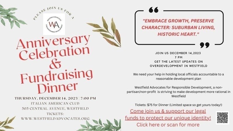 Westfield Advocates is Looking forward to seeing you there. Many of you have supported this grassroots organization for the past year as we advocate for responsibly scaled development that is compatible with the character of Westfield. Come celebrate this festive holiday season!
