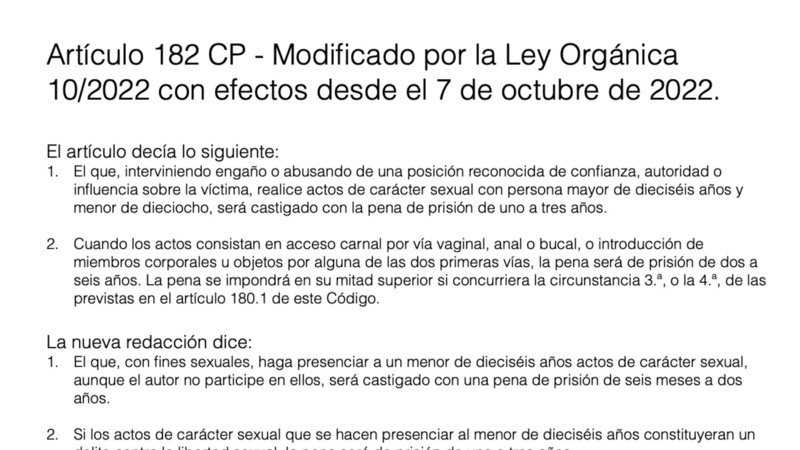 La Ley Orgánica 10/2022, de 6 de septiembre, de garantía integral de la libertad sexual modificó el artículo 182 del Código Penal español destipificando el delito de abuso sexual con menores de entre 16 y 18 años.