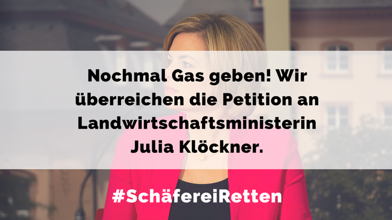 Mise à jour sur la pétitionRettet die letzten Schäfer/innen Deutschlands – Traditionsberuf am Ende! #SchäfereiRettenÜbergabe der Petition an Landwirtschaftsministerin Julia Klöckner.