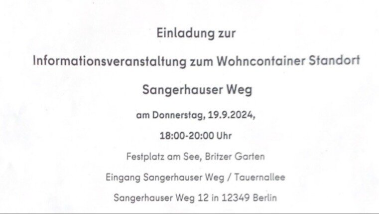 Am 26. März 2024 hat der Senat das genannte Programm beschlossen, mi; dem in ganz Berlin lt. Wohncontainer-Anlogen für Geflüchtete entstehen werden. Auch am Songerhouser Weg wird eine solche Unterkunft mit ca. 450 Plötzen entstehen. Geplant sind dreigeschossige 1emporäre Wohncontainer-Bauten. Dazu wird etwa die Hälfte des derzeit bestehenden Porkplorzes am Britzer Garten benötigt; der Rest soll weiterhin als Parkplatz zur Verfügung stehen. Derzeit isi von einer Realisierung der Bauten im 2. Ouorfol 2025 auszugehen.