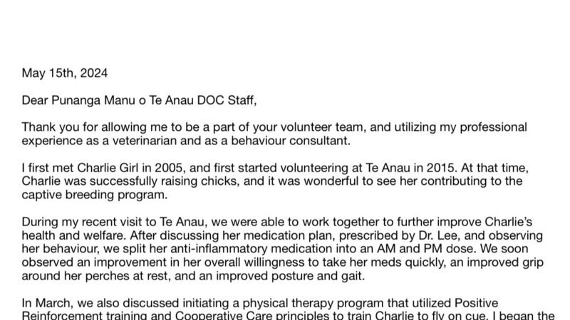 This letter was reviewed by the Captive breeding team and dismissed. Charlie Girl does not need to be moved and stressed in order to contribute to the captive breeding for release program. She has successfully raised over 20 chicks from her home in Te Anau. That’s an amazing achievement for Charlie Girl and her team. Let Charlie stay in her home.