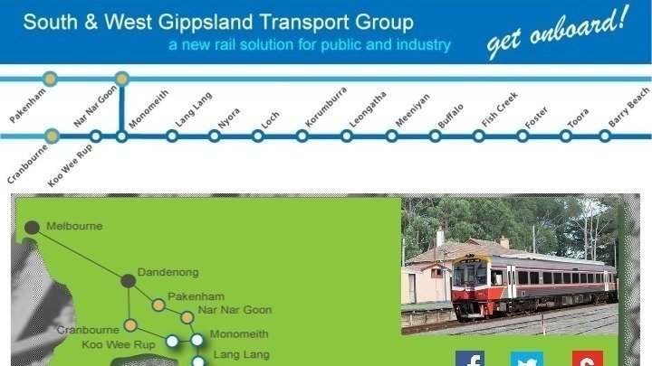 “The South & West Gippsland Transport Group aims to improve public transport. It is advocating the return of rail services to Leongatha, to establish a rail loop between Cranbourne and Pakenham and to improve bus services between towns and Melbourne”.