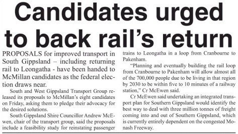 South Gippsland Shire Councillor Andrew McEwen, chair of the transport group, said the proposals would include a feasibility study for reinstating passenger trains to Leongatha in a loop from Cranbourne to Pakenham.