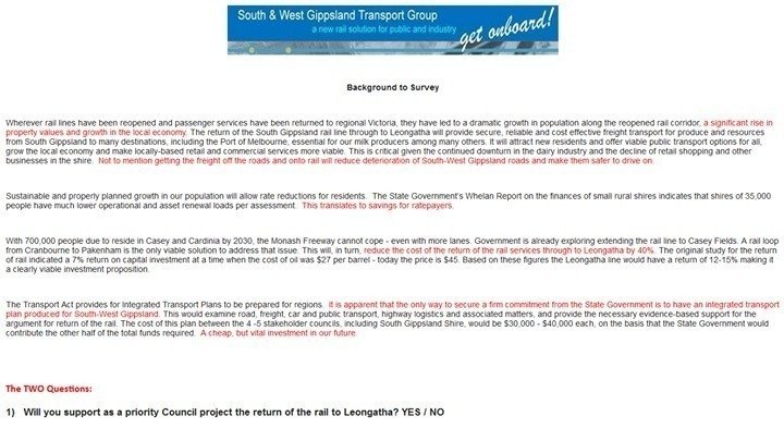 Petition updateReturn of the Leongatha to Melbourne Passenger Trains on the South Gippsland Rail CorridorSOUTH GIPPSLAND SHIRE MUNICIPAL ELECTION & QUERIES ABOUT GROUP INDEPENDENCE