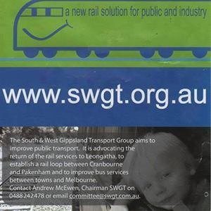 “The South & West Gippsland Transport Group aims to improve public transport. It is advocating the return of rail services to Leongatha, to establish a rail loop between Cranbourne and Pakenham and to improve bus services between towns and Melbourne”.