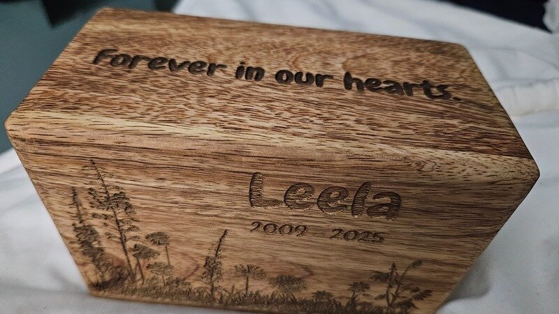 Picked up Leela's ashes at Herring Cove Veternary Clinic this morning. Organization told us to take her body there and they'd cover the cost; that they had an arrangement with that vet. We paid.