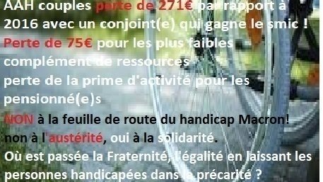 le complément de ressources est supprimé en faveur de la majoration pour la vie autonome 75.000 bénéficiaires vont perdre 75€/mois à terme, plus de prime d'activité pour plus de 10.000 pensionnés d'invalidités, hausse de la CSG pour les aidants, suppression des contrats aidés qui pourtant accompagnes près de 50.000 personnes handicapées en retour à l'emploi!