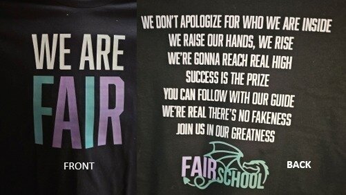- The shirts are black with “WE ARE FAIR” on the front, and feature a section of lyrics from the school song and the FAIR logo on the back.