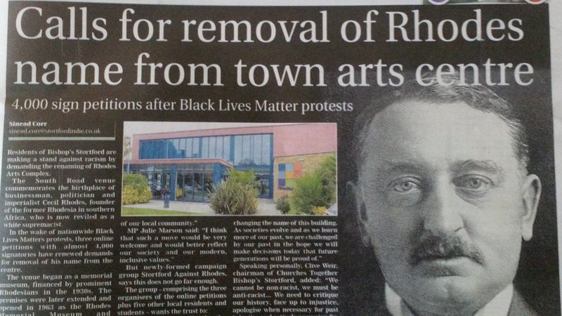 Firstly, our Stortford Against Rhodes campaign was featured on the front page of this week's Bishop's Stortford Independent, together with four further pages of history, letters, and comment about Rhodes. Their online article can be read here.