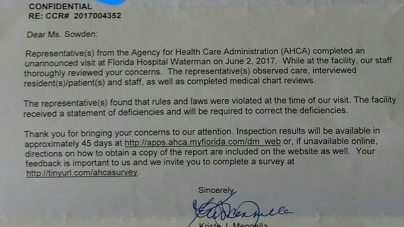 1st... I would like to say the whole letter from AHCA did not post for some reason. I will try to post it again. The hospital was found in violation of policies and laws.