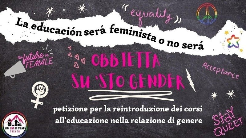 Quello che ci muove è una profonda preoccupazione in merito a ciò che sta accadendo nel nostro territorio. Nel 2018 ci siamo viste togliere da chi ci governa, i corsi all’educazione nella relazione di genere. Oggi, apprendiamo del disegno di legge n. 148 depositato il 3 giugno 2022 da alcunǝ consiglierǝ provinciali, che fa seguito in modo concertato alla richiesta contenuta nella petizione dall’associazione Pro Vita & Famiglia. Questo disegno di legge è volto alla modifica della legge provinciale sulla scuola del 7 agosto 2006, n. 5 (“Sistema educativo di istruzione e formazione del Trentino”). Nello specifico: se il disegno di legge diventasse realtà renderebbe ostico per gli istituti scolastici attivare liberamente, come sono titolati a fare, dei percorsi educativi che parlino di affettività e sessualità in modo inclusivo.