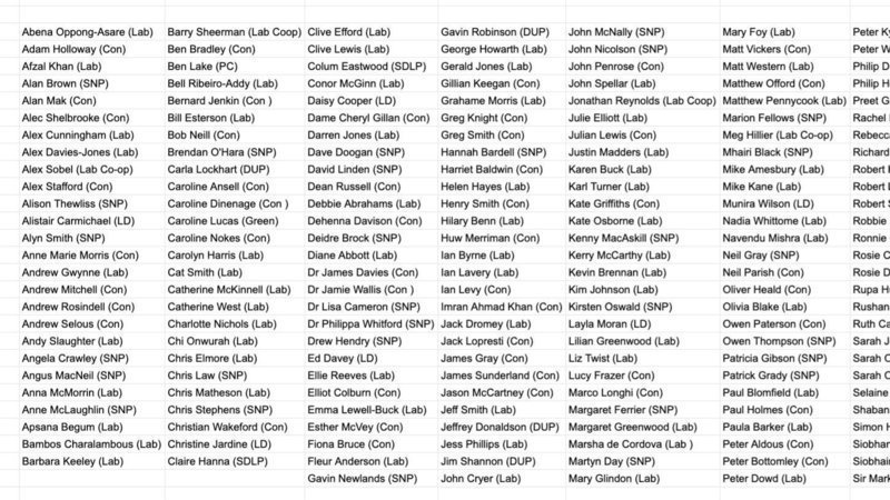 (Missing from end of picture): Phillip Davies, Phillip Holborne, Robert Halfon, Robert Largon, Roberts Syms, Robbie Moore, Simon Hoare, Siobhan Baillie, Stepehn Hammond, Stephen Metcalfe, Theresa Villiers, Tim Loughton, Tracey Crouch.