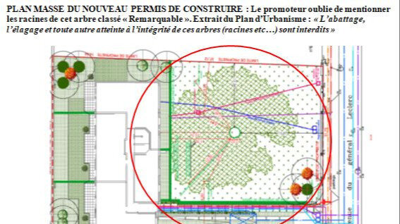 Pour ce 3ème permis d'octobre 2025, le houppier du Grand Chêne est un peu mieux pris en compte mais la construction reste trop proche et son système racinaire va être massacré.