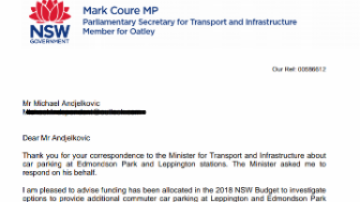 I am pleased to advise funding has been allocated in the 2018 NSW Budget to investigate options to provide additional commuter car parking at Leppington and Edmondson Park Stations.