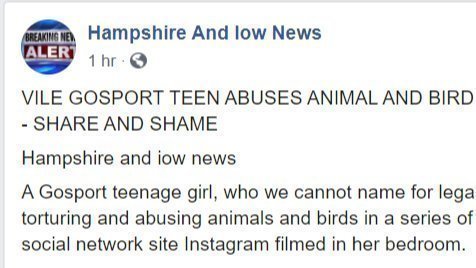 A Gosport teenage girl, who we cannot name for legal reasons has been torturing and abusing animals and birds in a series of videos posted on the social network site Instagram filmed in her bedroom....